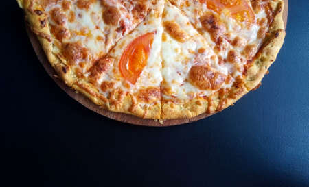 cut pizza fresh hot on a blue background. Top view, flat lay.