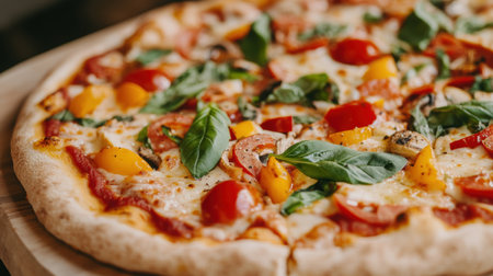 Fresh Homemade Pizza with Colorful Vegetables and Basil Leaves.