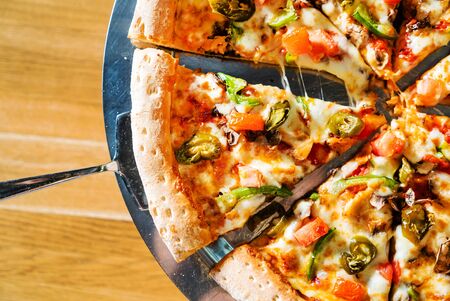 Slice of hot pizza large cheese lunch or dinner crust seafood meat topping sauce. with bell pepper vegetables delicious tasty fast food italian traditional on wooden board table classic in side view .