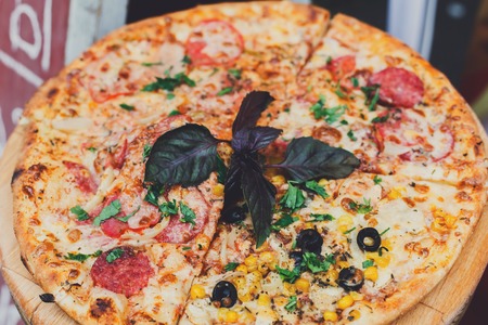Delicious italian pizza with pepperoni, chicken ham, corns and black olives - thin pastry crust at wooden desk. Pizza served outdoors by vendor on country fair picnic party, closeup of tasty snack.