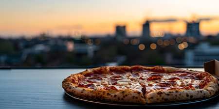 Delicious Pepperoni Pizza with Cityscape View at Sunset