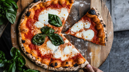 A mouth-watering margherita pizza features fresh basil and mozzarella on a wooden board, showcasing culinary artistry and delicious flavors. Perfect for sharing!