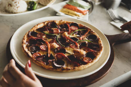 Hand of a girl in a red dress separating a slice of the mushroom pizza with peppers. Girl in a restaurant helping herself to a slice of pizza. Delicious freshly baked pepper pizza with meat.