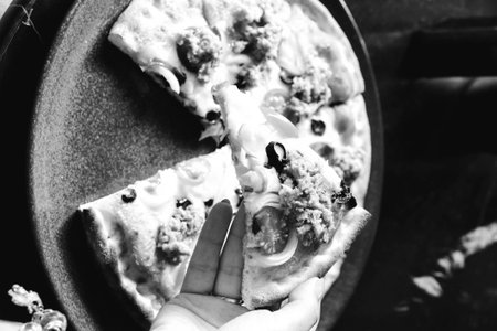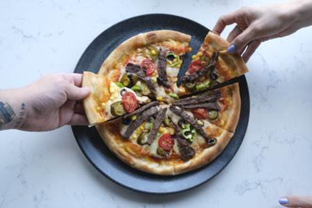 Top view of friends hands grabbing a BBQ pizza slice in a shared flat.