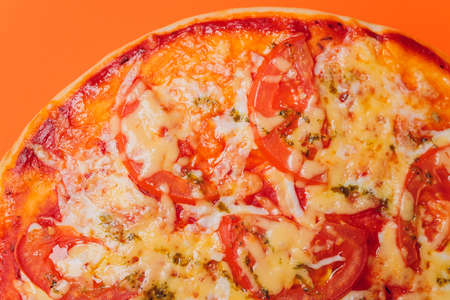 Pepperoni Pizza on an orange background above view. Delicious homemade pizza top view.