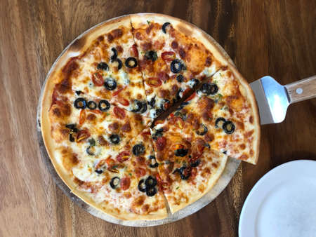 Delicious Italian food, homemade pizza with cheese, olives and herbs