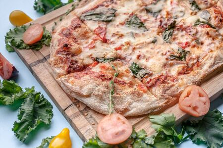 Close-Up Delicious Pizza on wooden cutting board top view. Mediterranean cheese snack, fast food, flour product. Fresh vegetarian nutrition. Italian pizza Margherita with Basil.