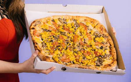 Italian cuisine concept. Female hands holding hot fresh big pizza in cardboard box. Delicious fast food meal. Delivery service