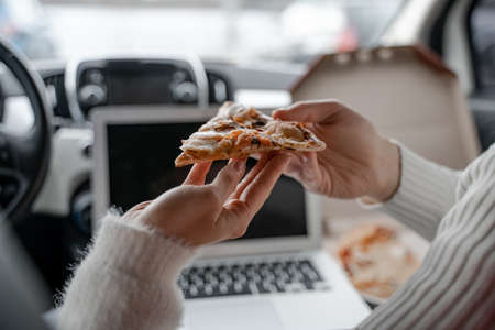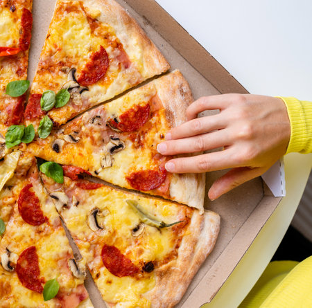 Pizza delivery. Italian pizza. hand holds a slice of pizza. online food delivery. fast food on the table