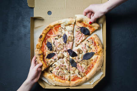 People take a piece of Italian Pizza in a cardboard box, dark background. Space for text. View from above. Pizza delivery.