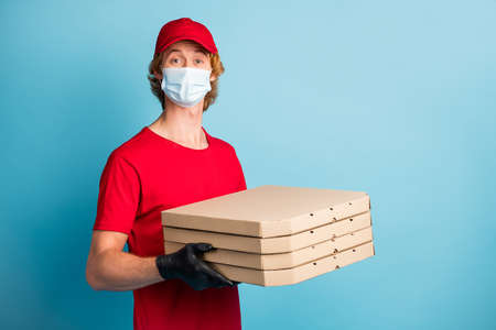 Food delivery courier in medical gloves with many boxes of pizza. Stay at home because coronavirus covid 19 killing people. Take away food from restaurant