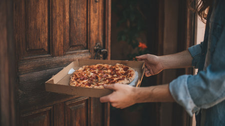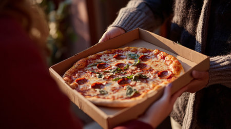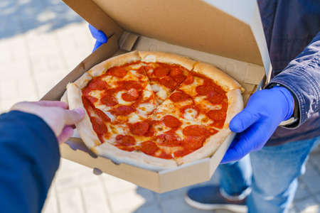 Close-up men's hands pass the order to pepperoni pizza. Food delivery to any place.