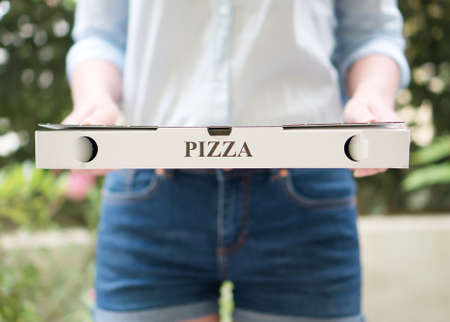 A man holds a box of pizza in his hands. Fast food in the fresh air