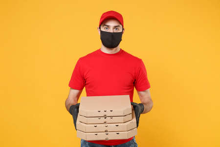 Delivery man employee in red cap t-shirt uniform black mask gloves give food order pizza boxes isolated on yellow background studio. Service quarantine pandemic coronavirus virus flu 2019-ncov concept
