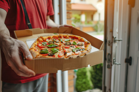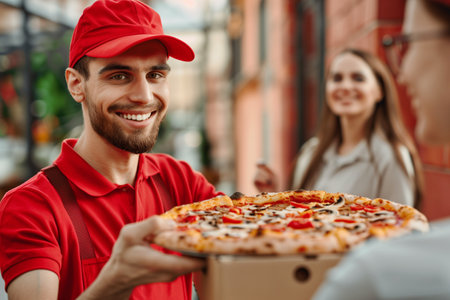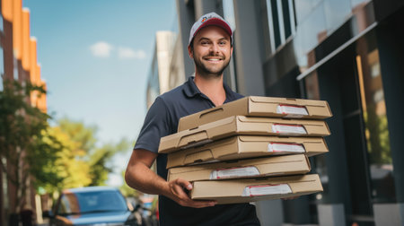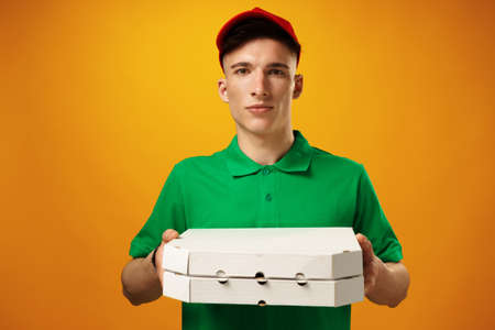 Pizza delivery, courier in uniform with boxes in his hands, Italian pizzeria food takeaway, pizza delivery service