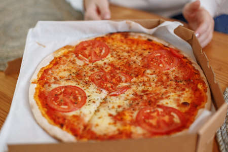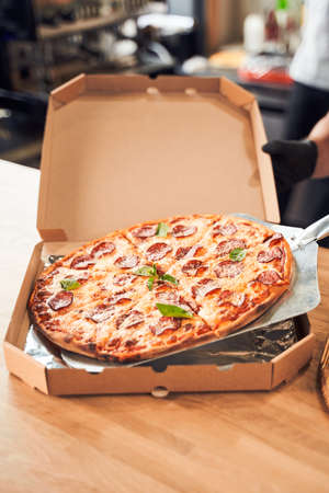 Pizza in a cardboard box on table ready to customer. Pizza delivery service with creative preparation