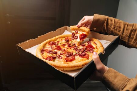 The female hand takes the first new piece of pepperoni pizza out of the delivery box. The concept of fast food.