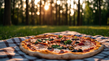 picnic .packing with pizza on green meadow