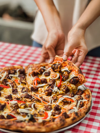 Woman taking a slice of the pizza on table
