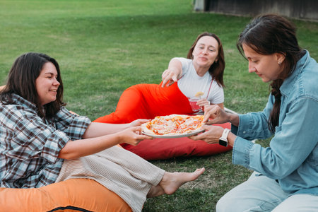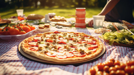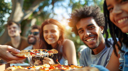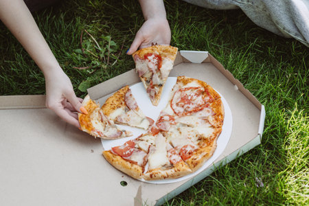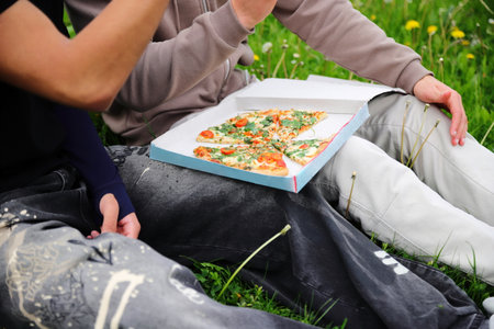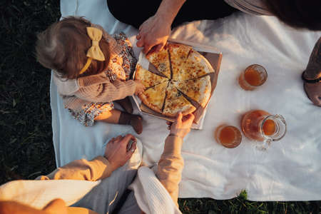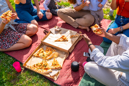 Family or friends having lunch with pizza outdoors on a picnic, on a sunny day on the grass