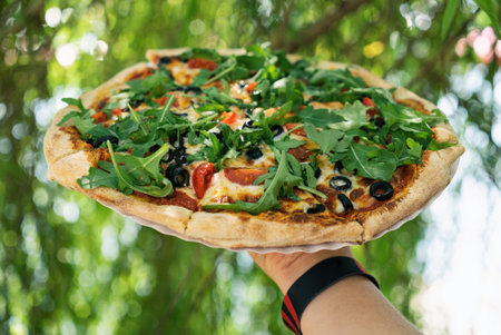 Vegetarian Pizza from the oven. Oven-baked vege pizza with arugula cheese and olives close up view. Holds pizza in his hands
