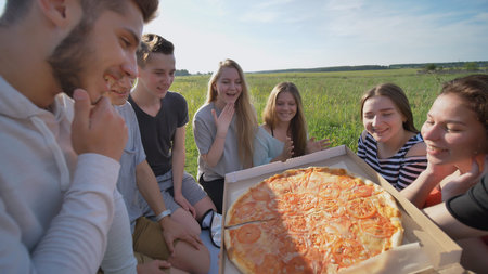 Friends of schoolchildren eat pizza outdoors during the sunset in the evening.