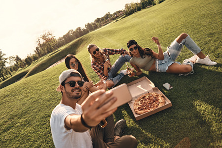 Creating happy memories. Group of young smiling people in casual wear taking selfie while enjoying food and drinks outdoors