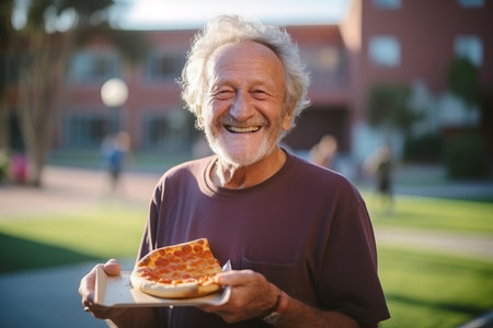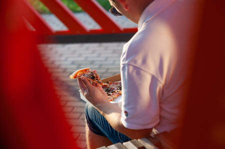 A man holds a slice of pizza in his hands. Fast food in the fresh air
