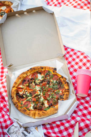Picnic Pizza. Red-checkered tablecloth. Italian picnic. Pizza with lots of cheese, herbs, and sausages. Margarita, 4 cheese, salami.