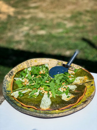 Pizza a green carpet on a sunny day.