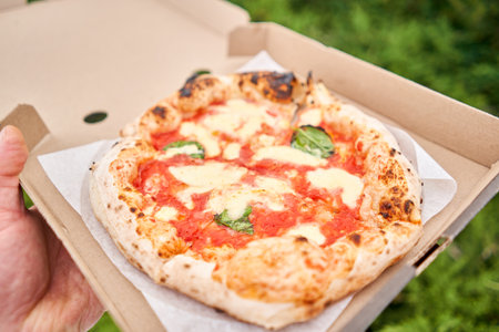 Pizza delivery concept. Baking in a cardboard box on a wooden background. Baked a delicious pizza Margarita in a traditional wood-burning oven in a Neapolitan restaurant, Italy.
