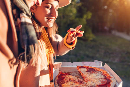 Loving couple having pepperoni pizza in fall park. Woman and man enjoy tasty food outdoors. Eating hot snack