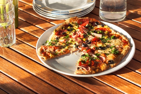 Piece of pizza close-up, concept of picnic and relaxation.