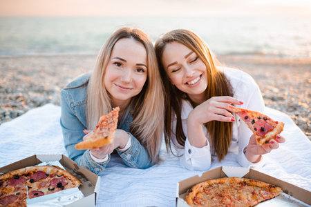 Two young beautiful girlfriends having fun with pizza at beach over sea shore outdoors in sun light. summer holiday season. Friendship. Happiness. Sisters spend time together at coastline.