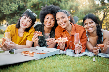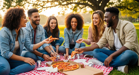 Find you friends wholl buy you pizza. Cropped shot of a group of young friends having pizza together during a picnic in a park.