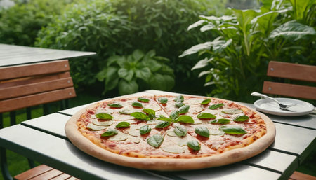 Overhead view of authentic Italian food shows nutritious fresh vegetable pizza with toppings and ready to eat.
