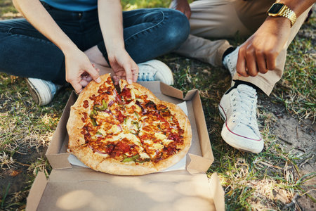 Friends, park and pizza with people relaxing outside for bonding, fun and fast food enjoyment. Consumables, junk food and man and woman relaxing in a garden while eating carbs and takeaway food