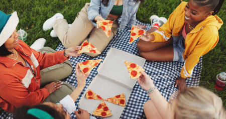 Pizza, above and people in park for eating fast food, lunch and meal on holiday in nature. Hands, taste or female person in garden on vacation for outdoor picnic, feast or bite of takeaway to relax
