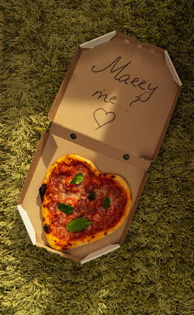 Pizza in the form of a heart lies in an open box with the inscription Marry me, on a green carpet on a sunny day.