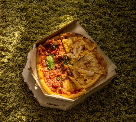 pizza slices with different fillings in a cardboard box
