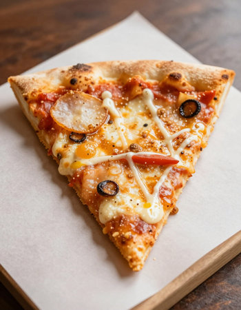Hot pizza slice with melting cheese on a rustic wooden table.