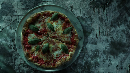 Homemade hot pizza with tomatoes, mozzarella and basil. Top view with copy space on dark stone table.
