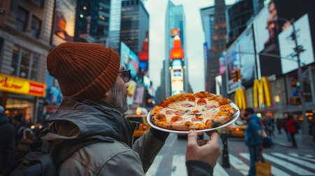 tourist enjoying his pizza on a busy street generative ai