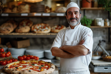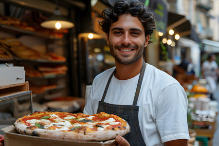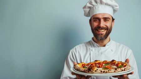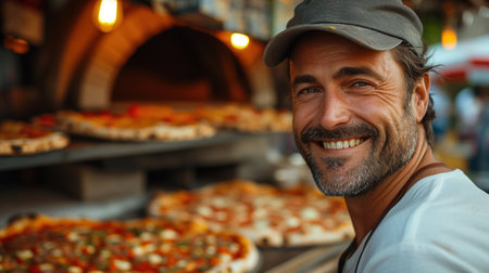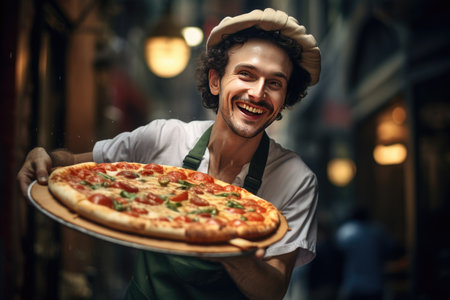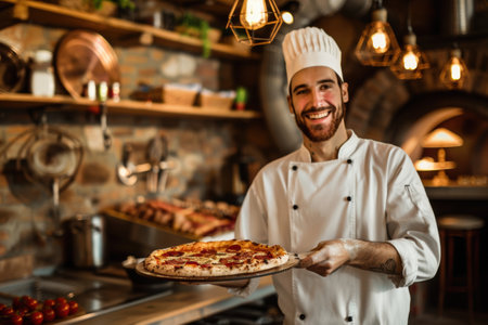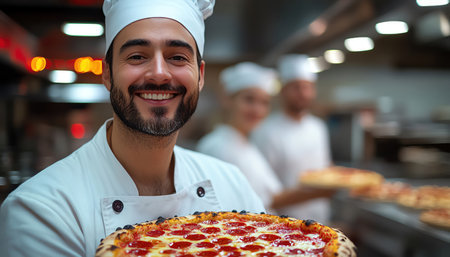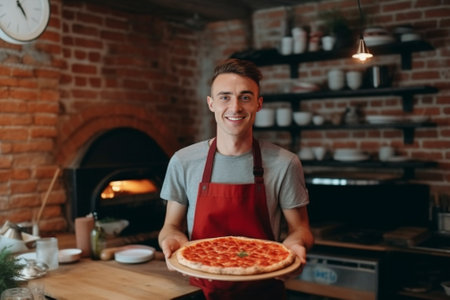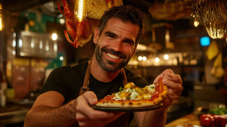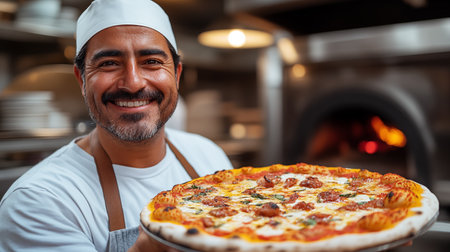 Italian chef holding a pizza in a cozy café, smiling warmly