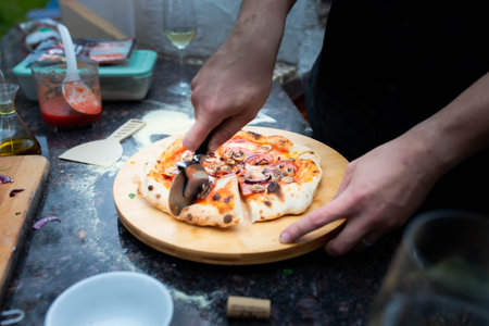 close up of hands Chef black shirt cutting freshly baked pizza, some ingredients flour around on table.