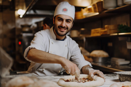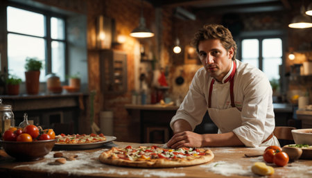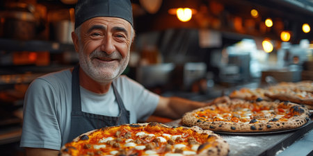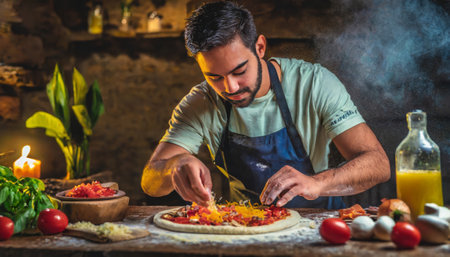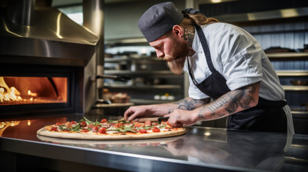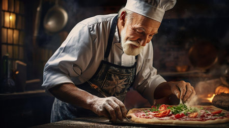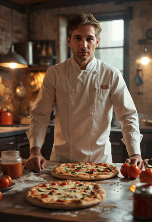 Focused pizza chef garnishes freshly baked gourmet pizzas in a rustic pizzeria kitchen