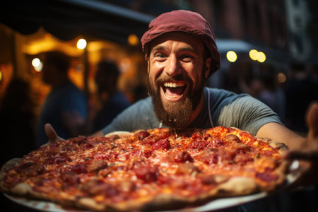 Worker Savor Pizza in Pause, authentic urban scene., generative AI
