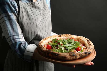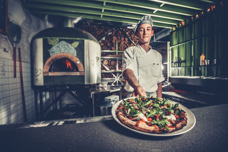Chef pizzaiolo prepared fresh delicious pizza close-up