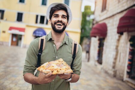 Young man eats a piece of appetizing pizza. Hungry guy holds a piece of pizza in his hands, looks at him and is going to eat it. Fast food.