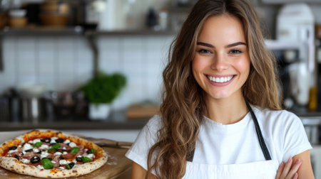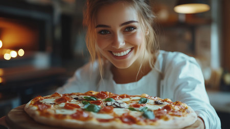 Happy female chef presents delicious pizza in a warm kitchen setting, highlighting vibrant toppings and inviting ambiance, perfect for food enthusiasts and culinary lovers